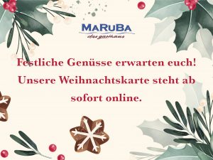 Unsere Speisekarten! Tagesgerichte, Speisekarte, Menüvorschläge für ihre Veranstaltung Speise- & Getränkekarte Englische Version Tagesempfehlungen Englische Version Aperitif Karte Weihnachtskarte 25. & 26.12.2025 Zurück Weiter Zurück Weiter Unsere Öffnungszeiten Jetzt reservieren! Montag RUHETAG Dienstag-Freitag 11:30-00:00 Uhr Samstag 11:30-01:00 Uhr Sonn- & Feiertage 11:30-22:00 Uhr 0621/34007 marubabuero@marubadasgasthaus.de Feudenheimerstr.2